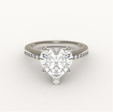 7. Lady Gaga’s setting is primarily a solitaire setting with five ‘claw’ prongs and tiny melee side-stone diamonds in an eternity band. The pave set diamonds that say “T♥S” is of course completely custom (created by Lorraine Schwarz), but you can still get the same ‘look’ without spending the big bucks. It’s clear that the focus of her ring is definitely her large heart shaped diamond. Here are a few settings that show off the beautiful heart shaped center stone: